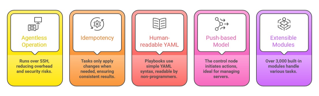 Ansible excels in modern DevOps environments due to its simplicity and power. Here's what makes it a go-to tool: