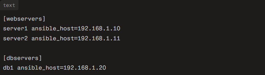 1. Inventory: A simple file (INI or YAML) listing managed hosts, grouped for targeted execution. Example:
