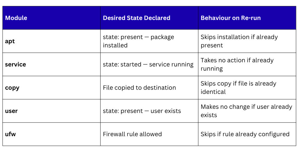 Ansible's modules are designed to be idempotent by default. Rather than executing commands blindly, each module checks the current state of the system before acting, and only makes a change if the current state does not match the desired state.