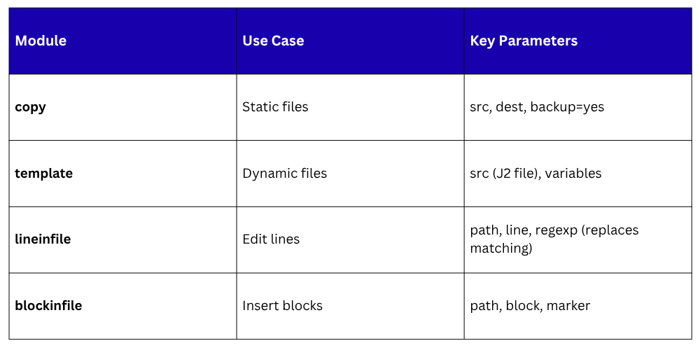 Ansible excels at configuration management through targeted modules and structured playbooks. Focus on these approaches: