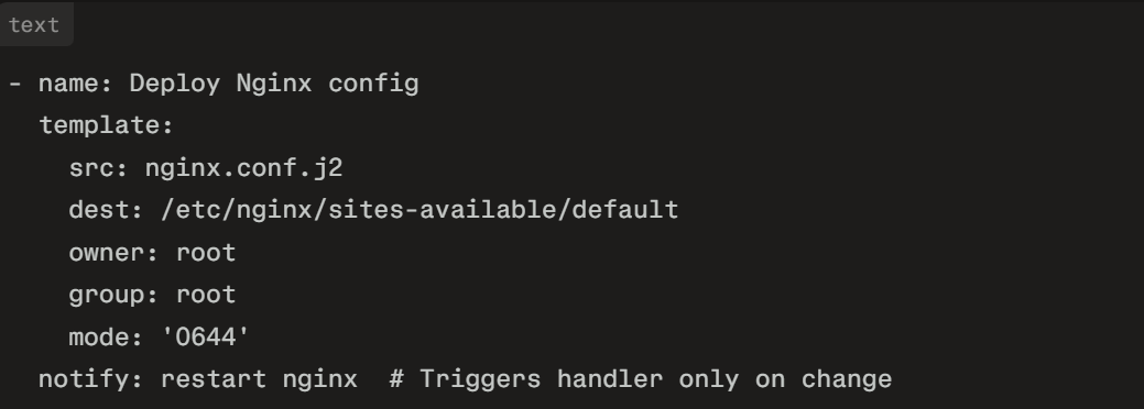 Variables in group_vars/webservers.yml: nginx_port: 80, server_name: example.com. This generates tailored configs idempotently.