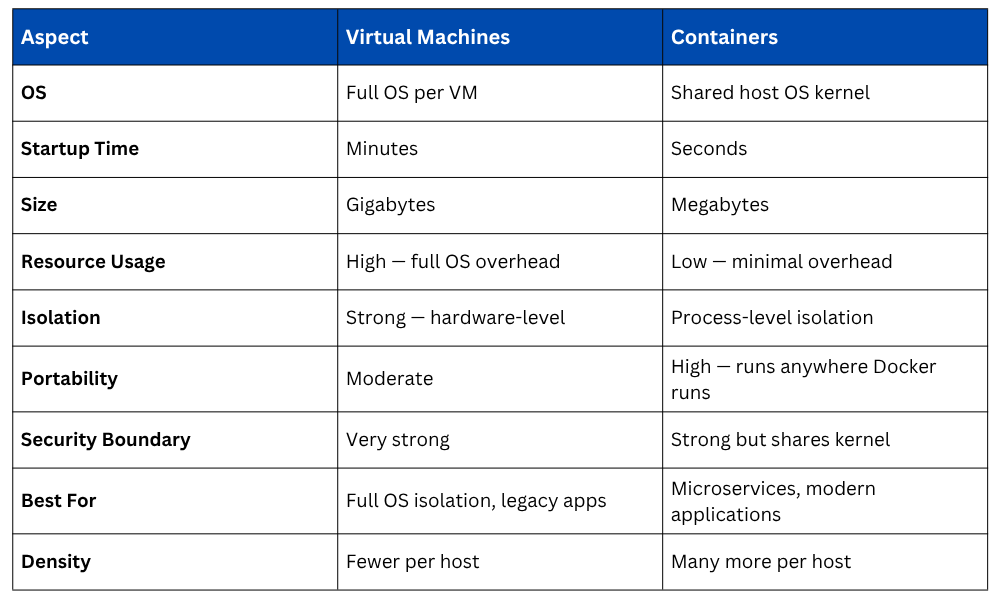 The critical architectural difference is clear — VMs carry a full OS per instance, while containers share the host OS kernel and only package what the application itself needs.