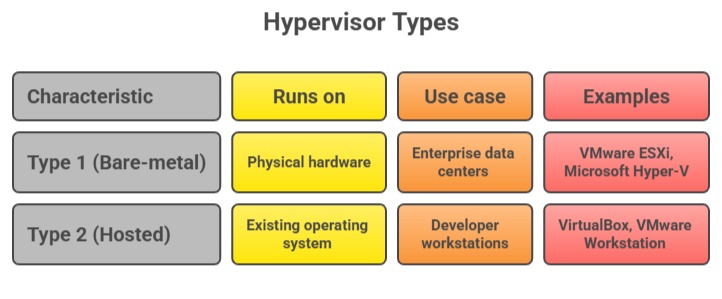 Popular hypervisors include VMware ESXi, Microsoft Hyper-V, KVM, and Oracle VirtualBox.