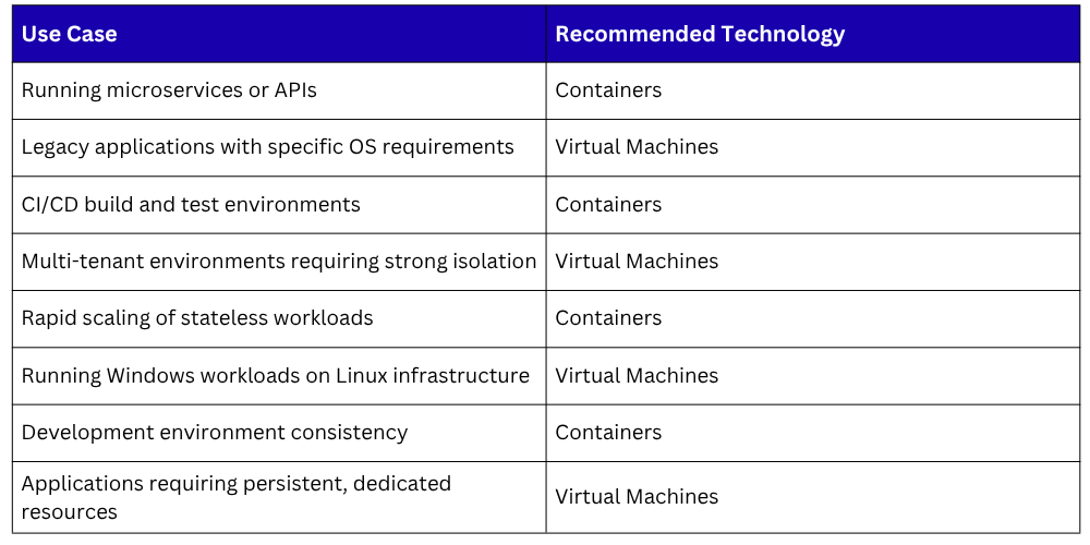 3. Legacy application support: Applications that require specific OS configurations, kernel versions, or drivers are better suited to VMs.