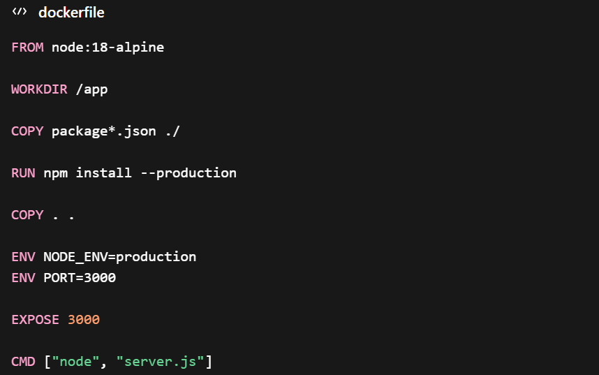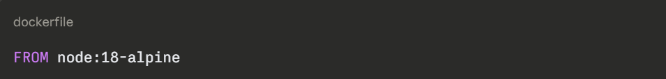 The Dockerfile starts with FROM node:18-alpine, which uses an official Node.js image based on Alpine Linux. This provides a lightweight and secure base with Node.js already installed.