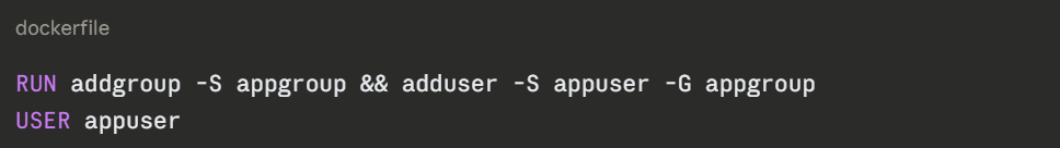 4. Run as a non-root user: By default, containers run as root, which is a security risk. Create and switch to a dedicated non-root user: