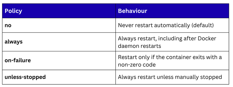 In production, containers must recover automatically from failures. Docker's restart policies handle this without requiring external monitoring or manual intervention.