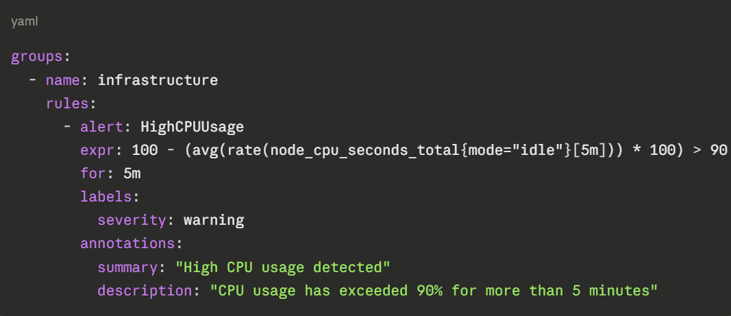 When a rule condition is met, such as CPU usage exceeding 90% for five minutes — Prometheus fires an alert and sends it to Alertmanager, which handles routing, deduplication, and delivery to notification channels like Slack, PagerDuty, or email.