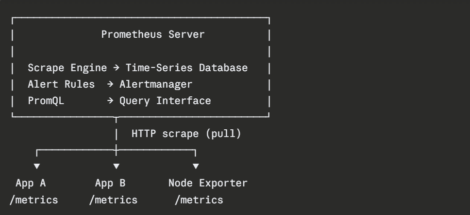 Prometheus is designed specifically for reliability and simplicity, it operates as a standalone server that collects metrics, stores them locally, evaluates alert rules, and exposes a powerful query interface.