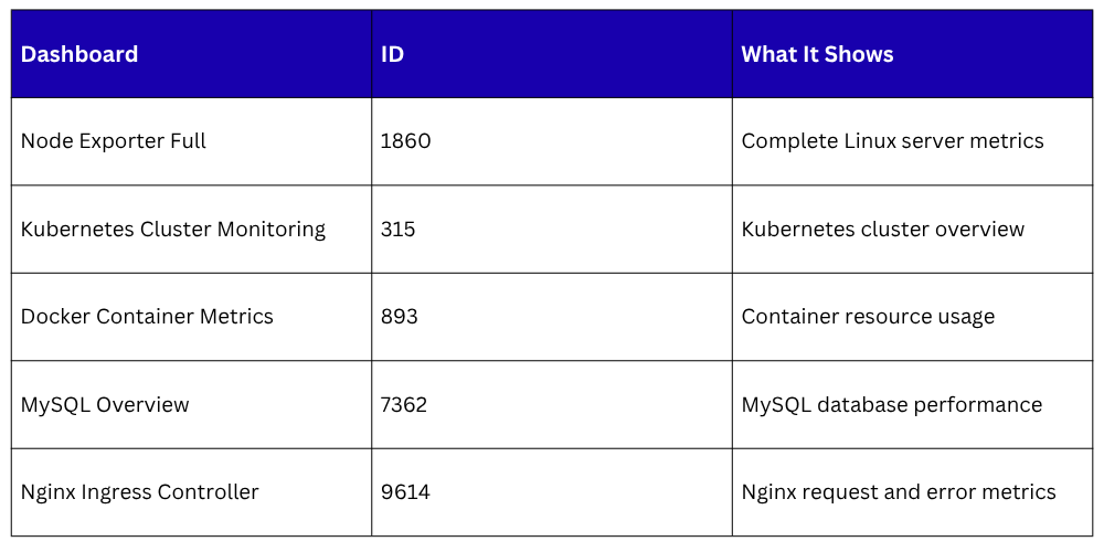 These dashboards cover virtually every common monitoring use case and can be imported into any Grafana instance in seconds using a dashboard ID.