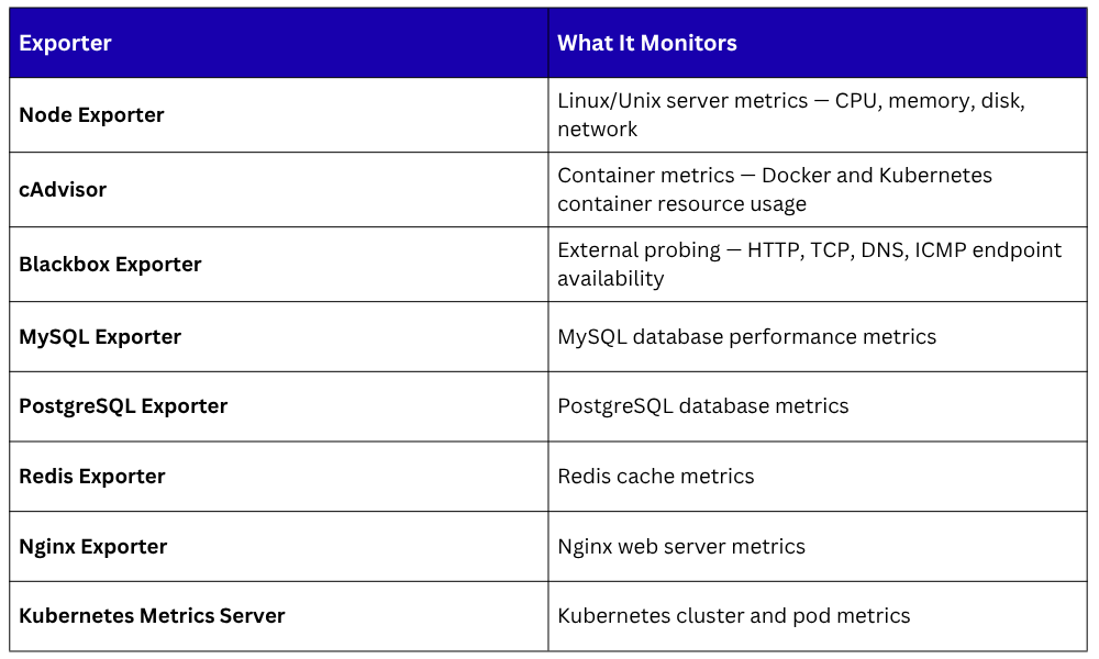 Not every application natively exposes a Prometheus-compatible /metrics endpoint. Exporters solve this, they are small agents that run alongside a system, collect its metrics, and expose them in Prometheus format for scraping.