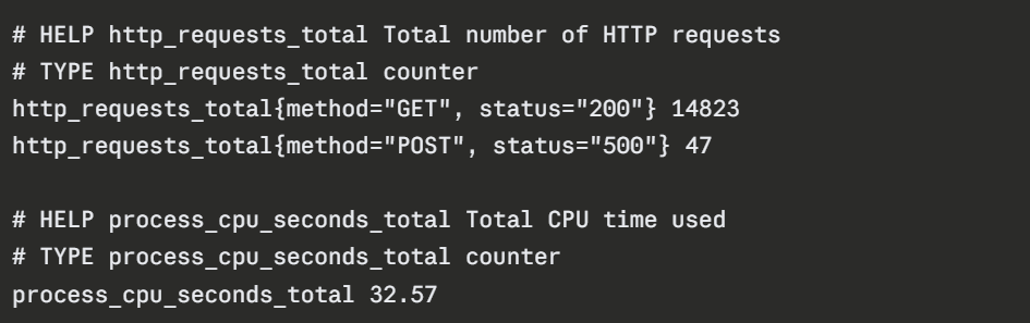 Each monitored application or system exposes a /metrics HTTP endpoint that Prometheus scrapes at a configured interval — typically every 15 to 30 seconds. The metrics endpoint returns data in the Prometheus exposition format — a simple, human-readable text format.