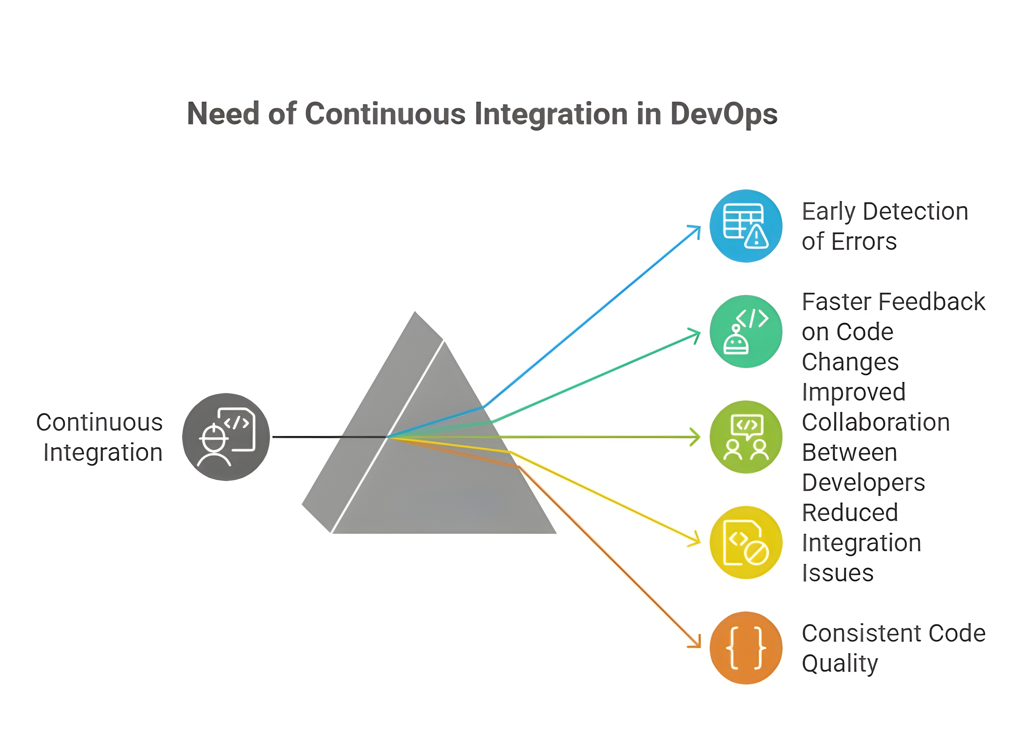 One of the major needs of CI in DevOps is to detect bugs as early as possible. CI automatically runs tests immediately after code is committed. This helps in identifying errors at the initial stage instead of discovering them during later phases like deployment or production. Early bug detection reduces risk, saves time, and lowers the cost of fixing issues.