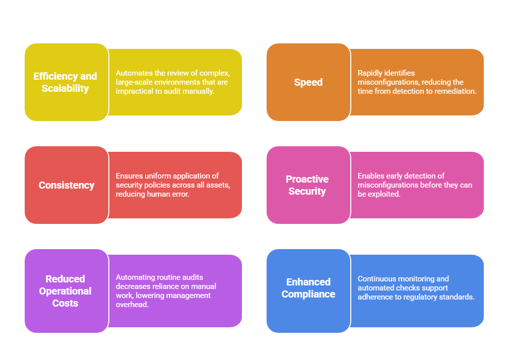 By automating routine reviews and providing continuous monitoring, AI enables proactive and scalable security management. Here are the essential benefits that showcase its role in detecting and addressing configuration weaknesses.