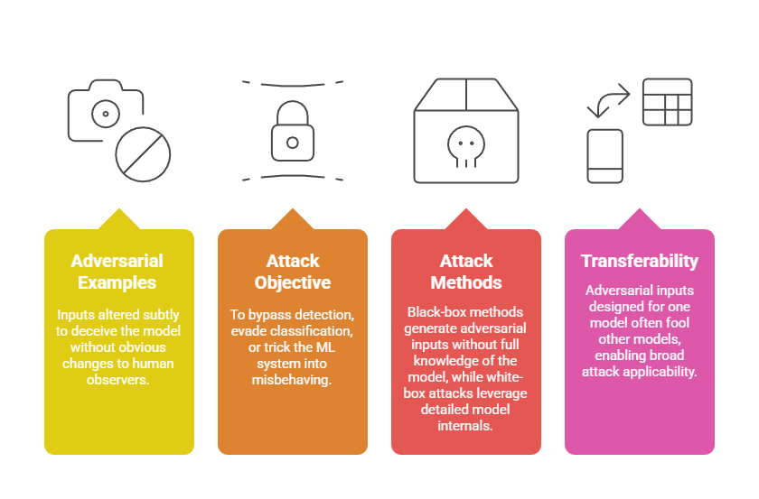 Evasion attacks take place during the model inference or prediction phase. In this case, attackers craft adversarial inputs that, while appearing normal to humans, cause the model to generate incorrect or unexpected results. Important features include: