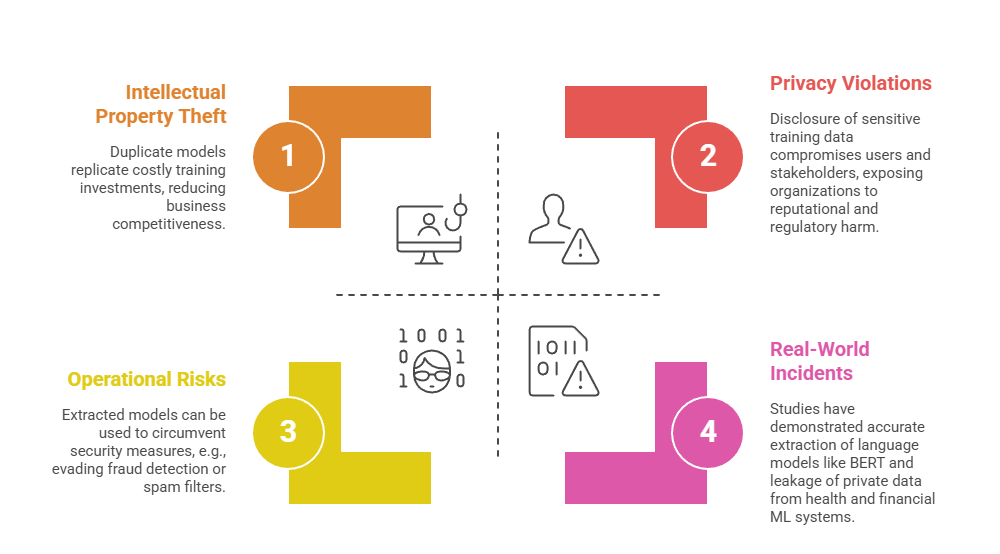 Extracted models don’t just replicate capabilities—they expose vulnerabilities and sensitive information. The following points highlight major impacts and notable examples from real environments.
