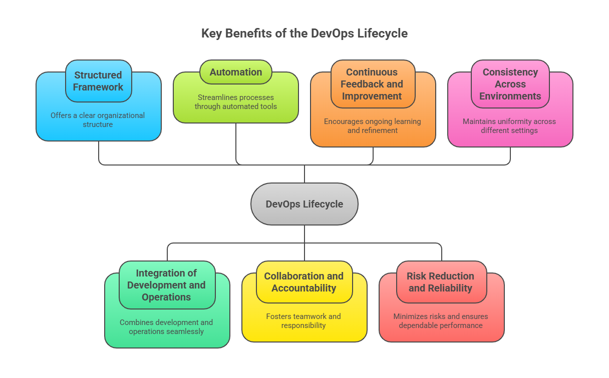 By following a defined lifecycle, DevOps manages the complexity and risk of modern software systems. Each stage includes checkpoints, testing, and validation, which prevent errors from propagating into production. The lifecycle ensures that deployments are controlled, predictable, and reliable. Without it, organizations would face higher chances of failures, downtime, and customer dissatisfaction.