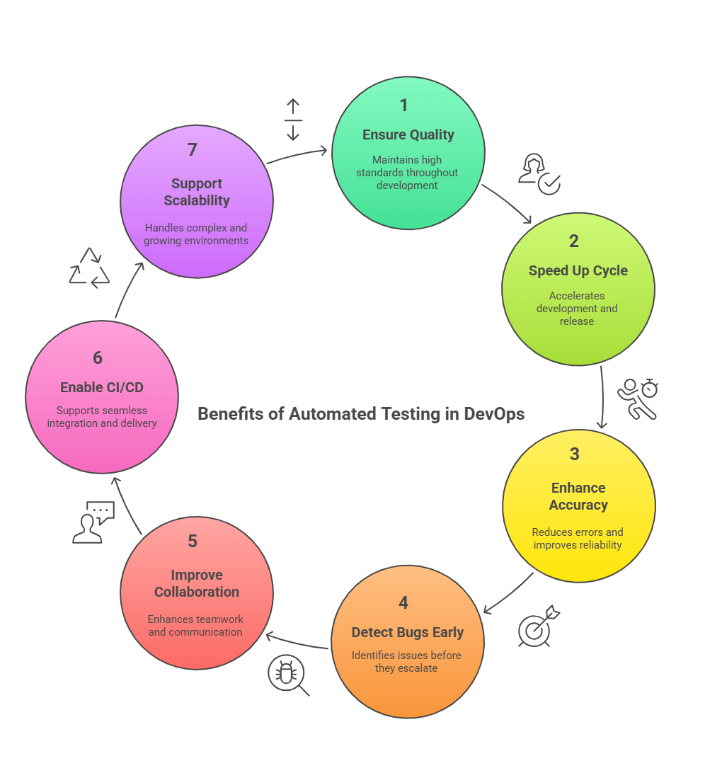 Automated testing delivers instant feedback to developers after every build, helping them identify and fix issues immediately.This continuous feedback loop not only improves code quality but also supports the DevOps culture of continuous improvement and learning.Quick feedback ensures smoother workflows and reduces delays in the software delivery process.