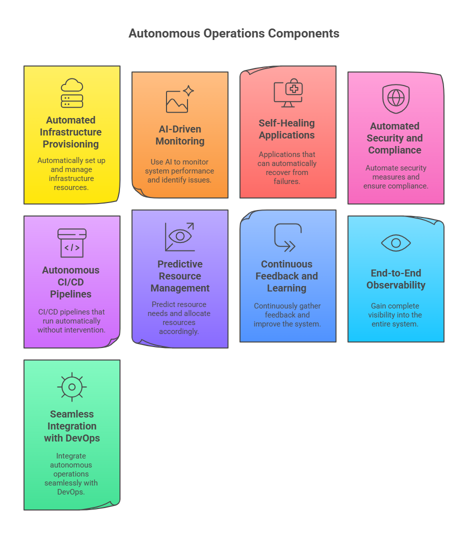 A core goal of DevOps is to build reliable, resilient, and observable systems. Autonomous Ops reinforces this by integrating AI-driven monitoring, predictive analytics, and self-healing mechanisms. Systems can detect anomalies, anticipate failures, and take corrective actions automatically, such as restarting services, replacing faulty instances, or rerouting traffic. This predictive and autonomous behavior enhances uptime, improves application performance, and ensures continuity of service without requiring constant human supervision. In essence, Autonomous Ops takes DevOps’ principles of observability and proactive incident management to a higher level of sophistication.
