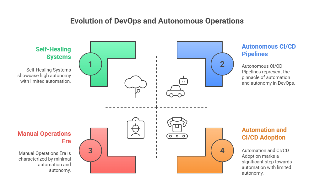 The evolution towards NoOps (No Operations) and Autonomous Operations (Autonomous Ops) represents the next stage in the DevOps journey, where full automation, AI-driven intelligence, and self-managing systems significantly reduce—or even eliminate—the need for manual operational intervention.