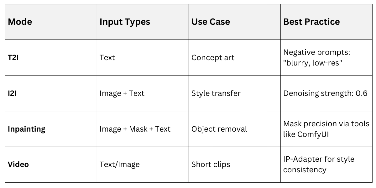 Latent diffusion shines in multimodal setups, blending inputs like text+image or audio+video. Stable Diffusion's conditioning mechanism supports img2img, inpainting, and control nets for precise control.