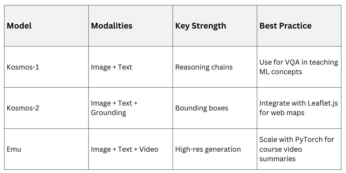 Kosmos-1 (Microsoft, 2023) and its successors like Kosmos-2 introduce grounding tokens to link text spans to image regions, enabling tasks like visual question answering (VQA) with precise localization.