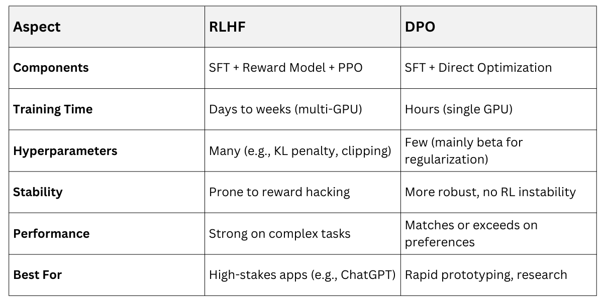 In practice, DPO excels in prompt design workflows—fine-tune a base model on domain-specific preferences (e.g., legal writing: precise and formal) without RL overhead.