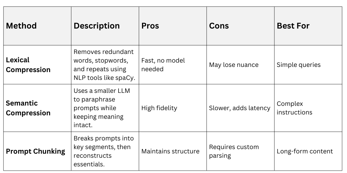 Practical Example: Original prompt—"Please analyze this sales data from Q1 2024, focusing on trends in electronics sales across regions like North America and Europe, and provide a summary with visualizations if possible"—compresses via semantic method to: "Summarize Q1 2024 electronics sales trends by region (NA, Europe); suggest visuals."