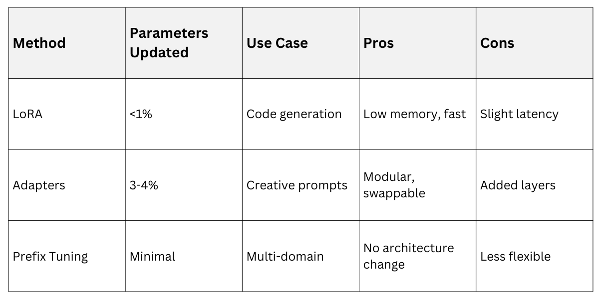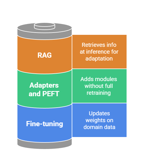 Techniques like LoRA insert small trainable adapters, updating under 1% of parameters.