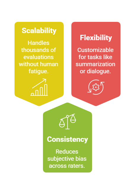 This approach mimics human evaluation but scales efficiently, making it ideal for high-volume testing during development.
