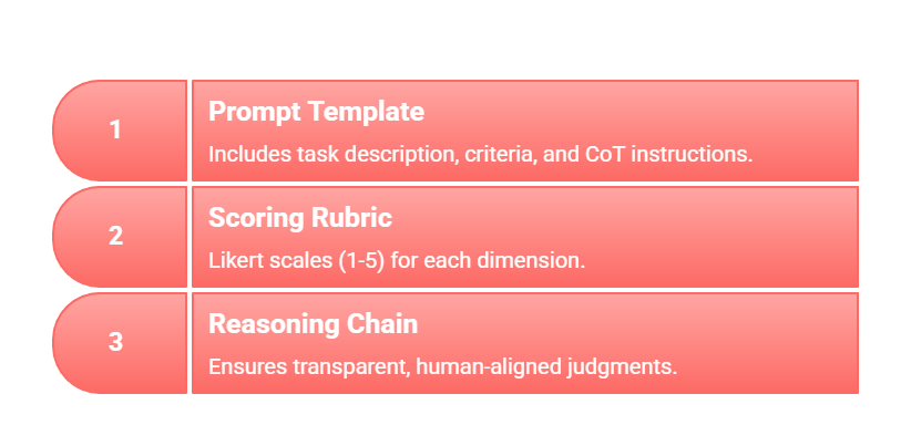 Unlike single-metric tools, G-Eval prompts the LLM (typically GPT-4) with task details and criteria, generating step-by-step reasoning before final scores. This makes it adaptable—no need for separate prompts per metric.