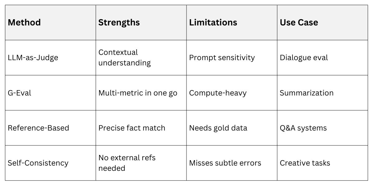 Practical Example: In a news summarizer, use G-Eval to score "Does this avoid inventing events?" This ensures deployment-ready models, a best practice from industry leaders like OpenAI and Anthropic.