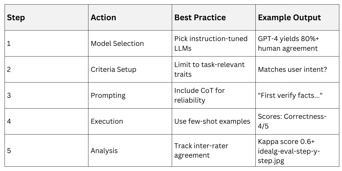 Example Prompt Snippet: "Evaluate this summary for correctness and conciseness. Step 1: Identify key facts from reference. Step 2: Compare output. Step 3: Score each 1-5."