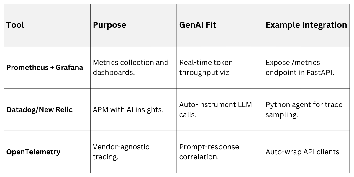 3. AI-specific: Tokens generated, hallucination scores via semantic checks.