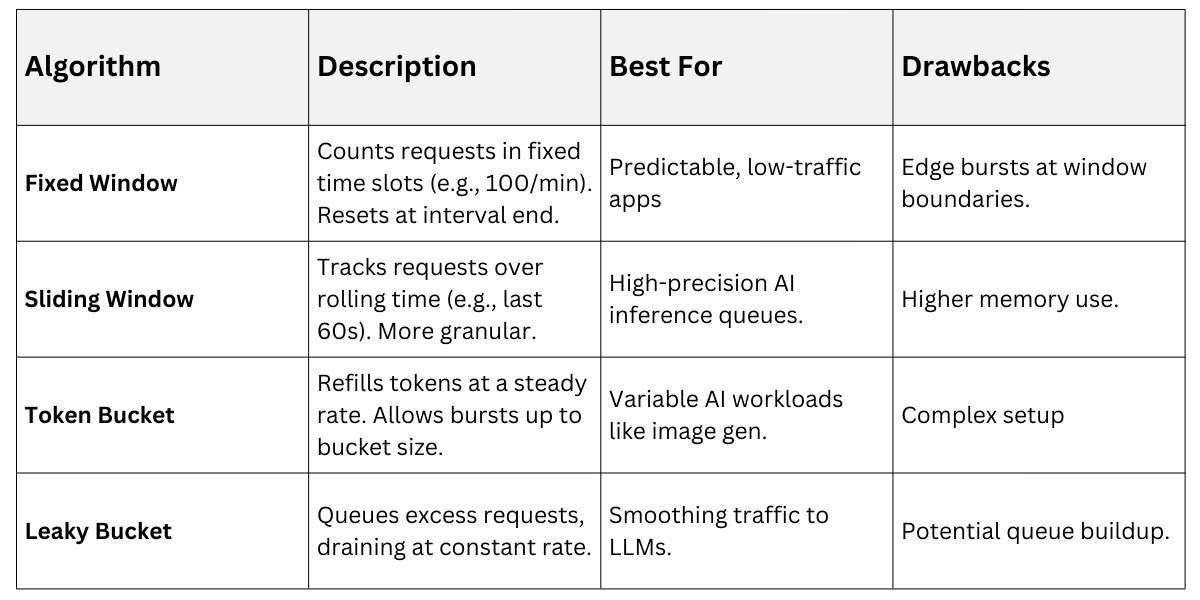 Implement client-side and server-side limiting to handle bursty traffic from concurrent prompt generations. Common algorithms include fixed-window counters for simplicity and token bucket for smoothing spikes.
