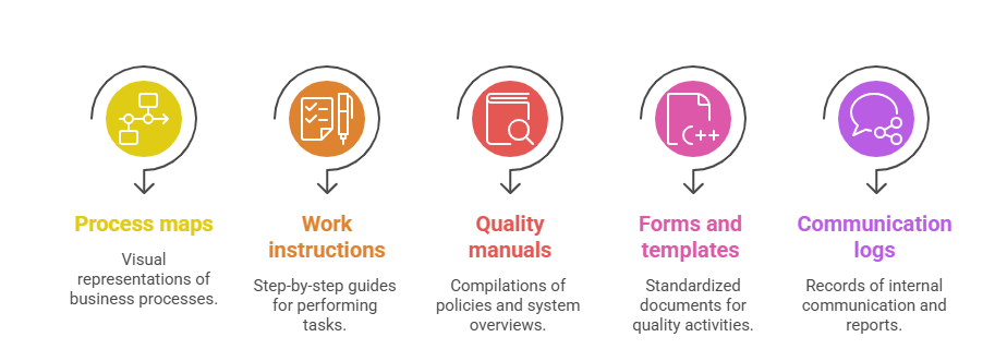 5. Records and Evidence: These include records related to training, process outputs, product conformity, audits, corrective actions, and management reviews. Records serve as proof that processes are followed and outcomes meet requirements.