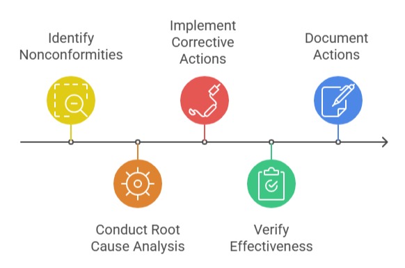 4. Verification and Effectiveness Review: After implementation, the effectiveness of corrective actions is assessed to confirm that the issue is resolved and does not recur.