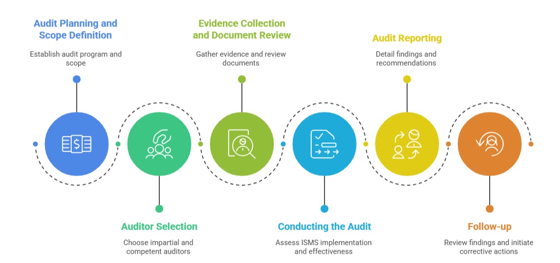 Internal audits help verify that the ISMS is functioning as intended and meeting standard requirements. Below are the essential stages of the internal audit process.