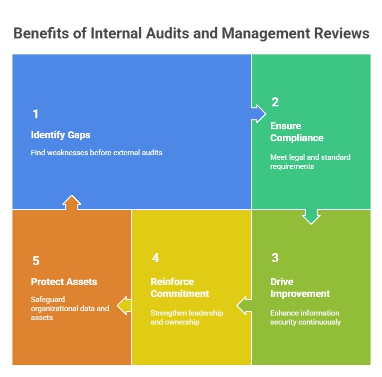 Conducting internal audits and management reviews is a vital part of maintaining an effective Information Security Management System (ISMS) aligned with ISO/IEC 27001 standards. These processes ensure the ISMS is properly implemented, conforms to the organization's policies and ISO requirements, and continues to improve.