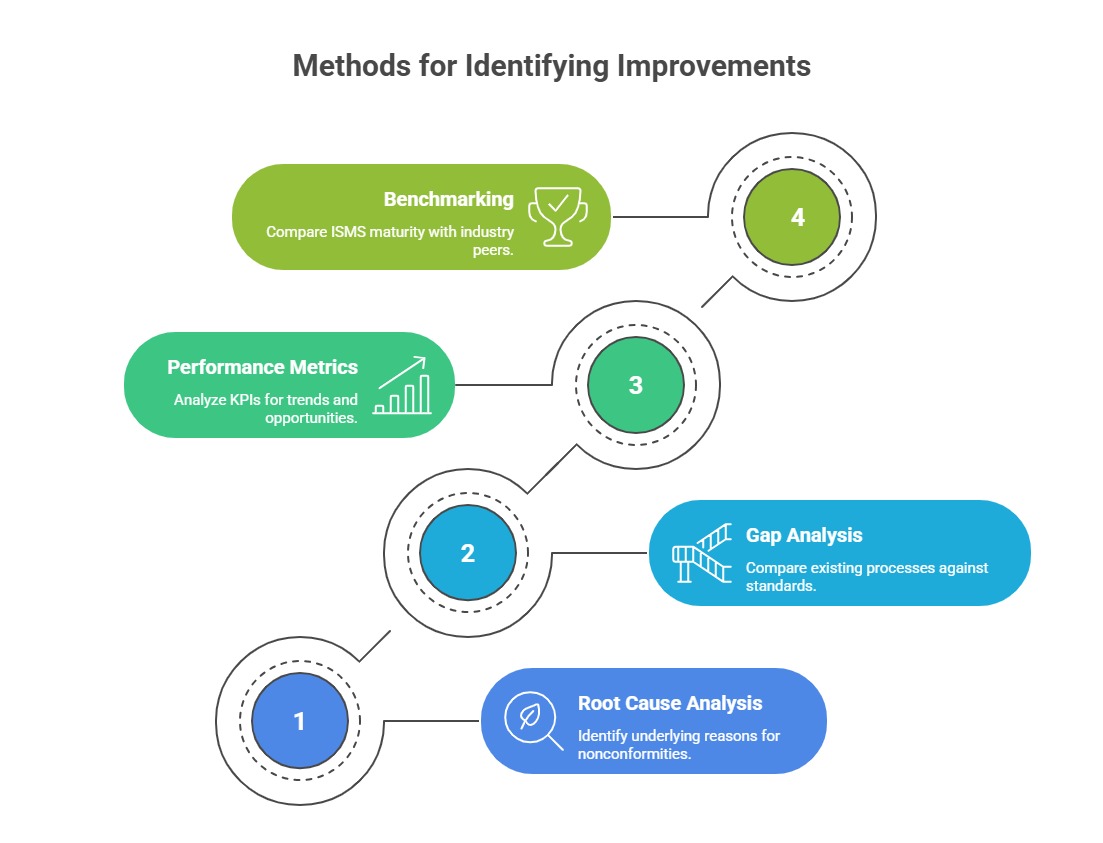 Identifying opportunities for improvement enables organizations to enhance their security posture, adapt to evolving threats, and ensure compliance. It’s a proactive approach that drives the ISMS towards increasing maturity and resilience.