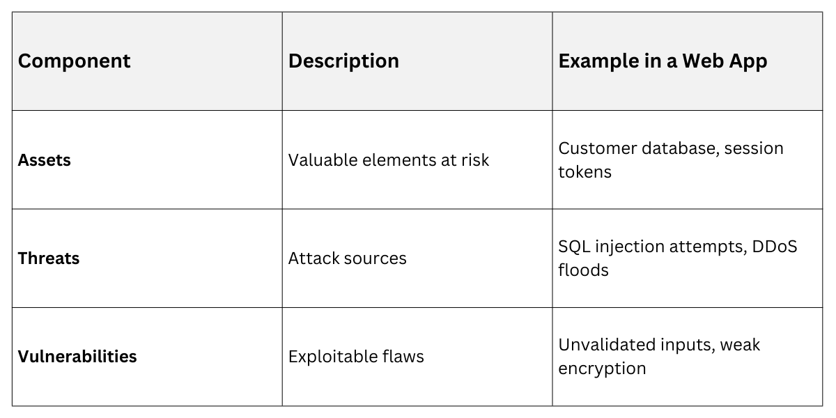 This table highlights how risks emerge when threats meet vulnerabilities—think of it as a lock (vulnerability) waiting for a thief (threat) to target your safe (asset).