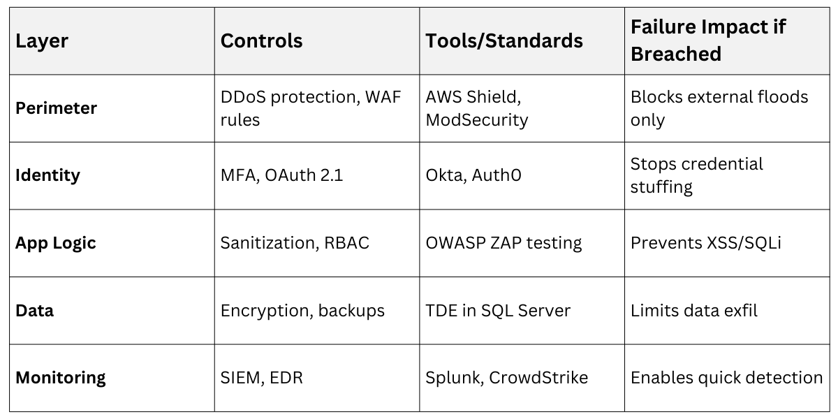 1. Perimeter: Firewalls, WAFs (e.g., Cloudflare or AWS WAF).