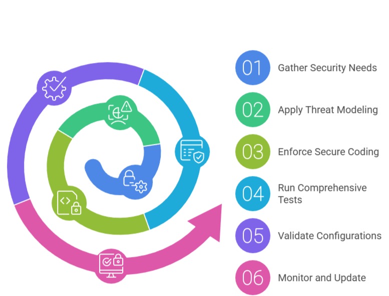 1. Requirements Phase: Start with security by defining threat profiles and compliance needs, avoiding vague specs that invite flaws.