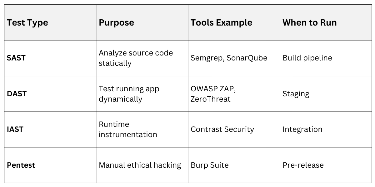 Include fuzzing for edge cases and SCA for open-source risks.