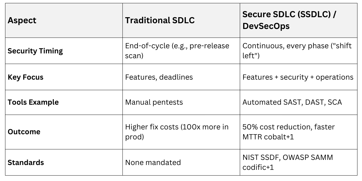 Traditional SDLC focuses on functionality and speed, often treating security as an afterthought, which leads to costly fixes in production.
