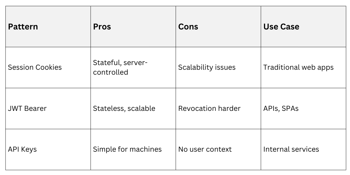 Authentication focuses on confirming who a user or service is, while authorization determines what actions or resources that identity is allowed to access. Well-designed patterns help enforce security policies consistently across applications, services, and APIs.