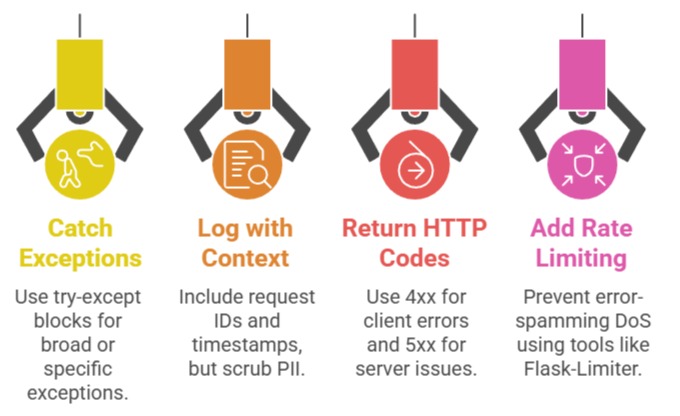 In practice, map exceptions to safe responses. For instance, in Python Flask