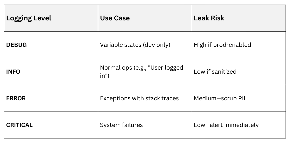 2. Sensitive data in logs: User PII, tokens, or credentials logged accidentally.