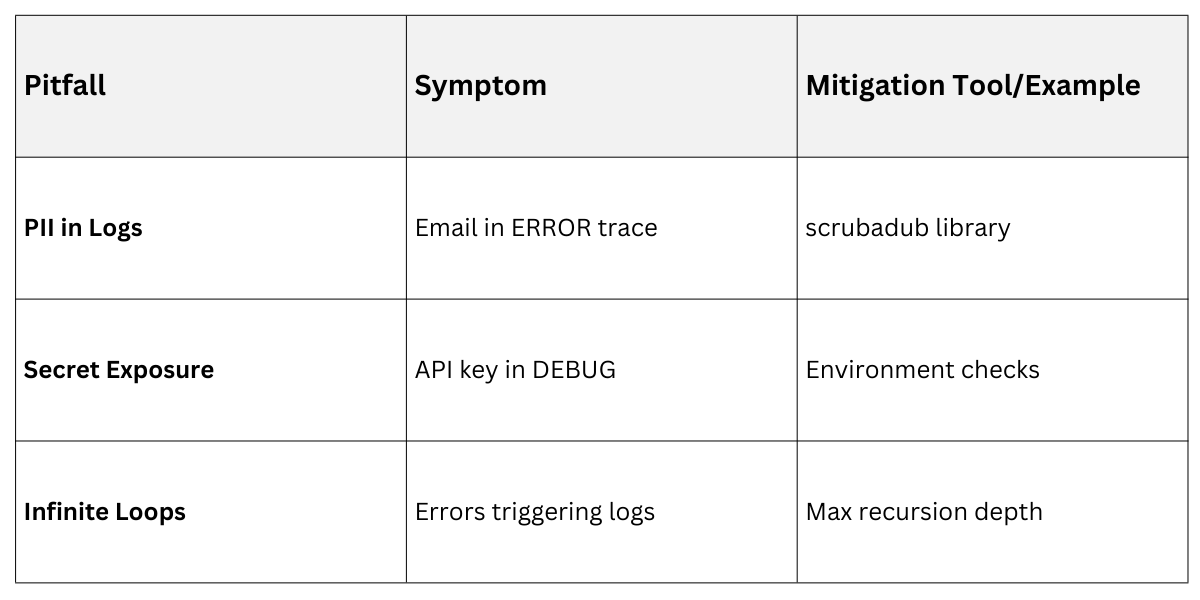 3. Avoid concatenation: Use parameterized logging: logger.error("Failed for user_id=%s", user_id) not f"Failed for {user.email}".