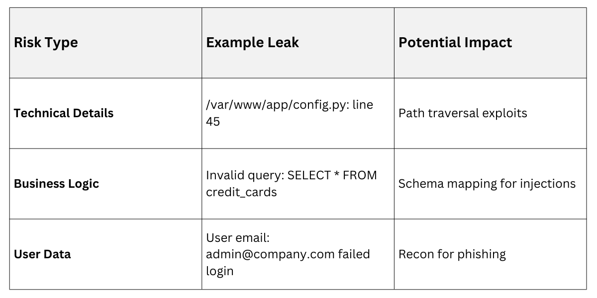 Attackers probe apps with malformed inputs to trigger errors, hoping for leaks. Verbose errors amplify this: a stack trace might spill server details, encryption keys, or query structures, enabling targeted attacks.